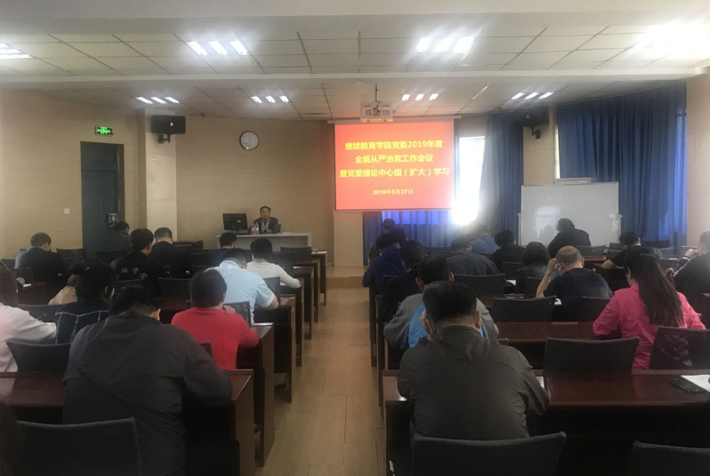 2019年5月27日下午,学院党委在沈河校区主楼Z102召开了继续教育学院党委2019年全面从严治党工作会议暨学院理论中心组扩大学习,继续教育学院与沈河校区两个部门的全体党员和部分职工参加了会议,会议由学院党委书记卢俊杰主持。