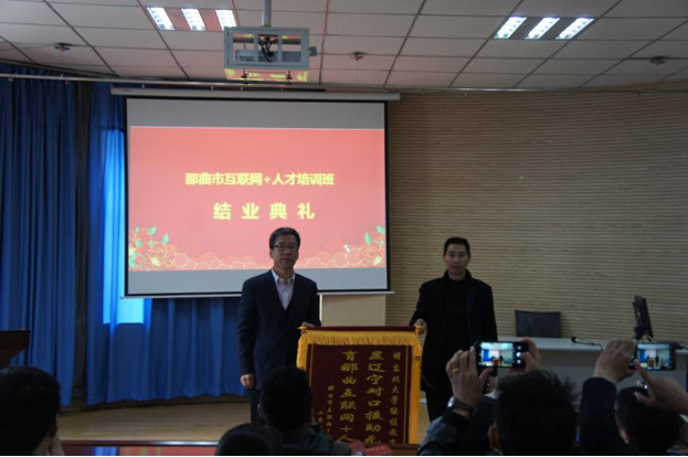 张凤都院长为学员颁发结业证书,并接受西藏那曲市经信局党组成员副局长汤春林代表全体学员向东北大学继续教育学院赠送的锦旗。