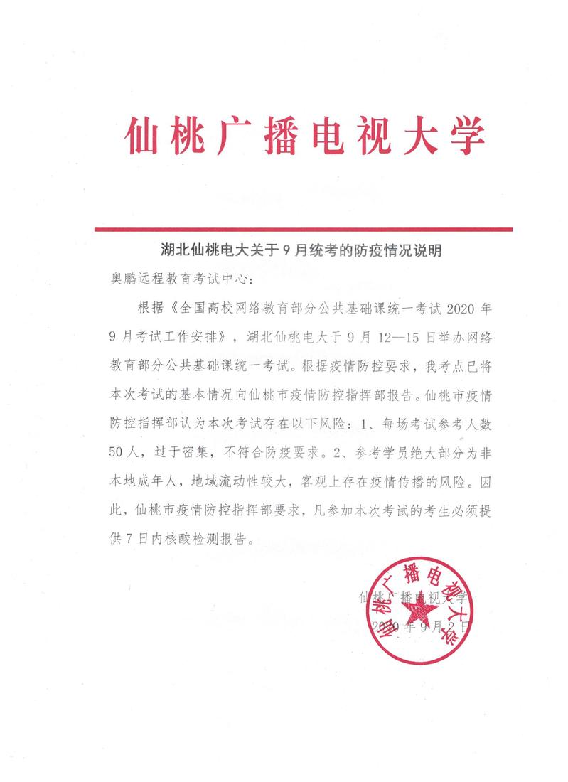 转发:湖北仙桃电大关于9月统考的防疫情况说明
