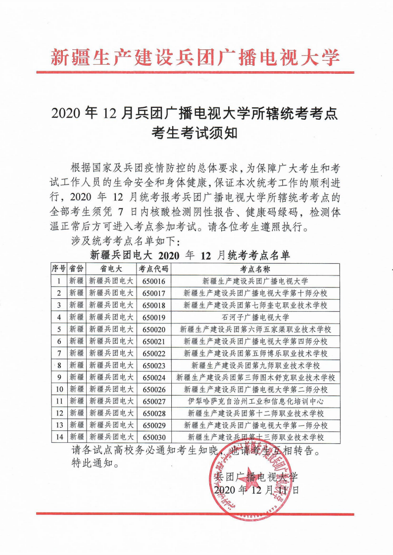 转发:2020年12月兵团广播电视大学所辖统考考点考生考试须知
