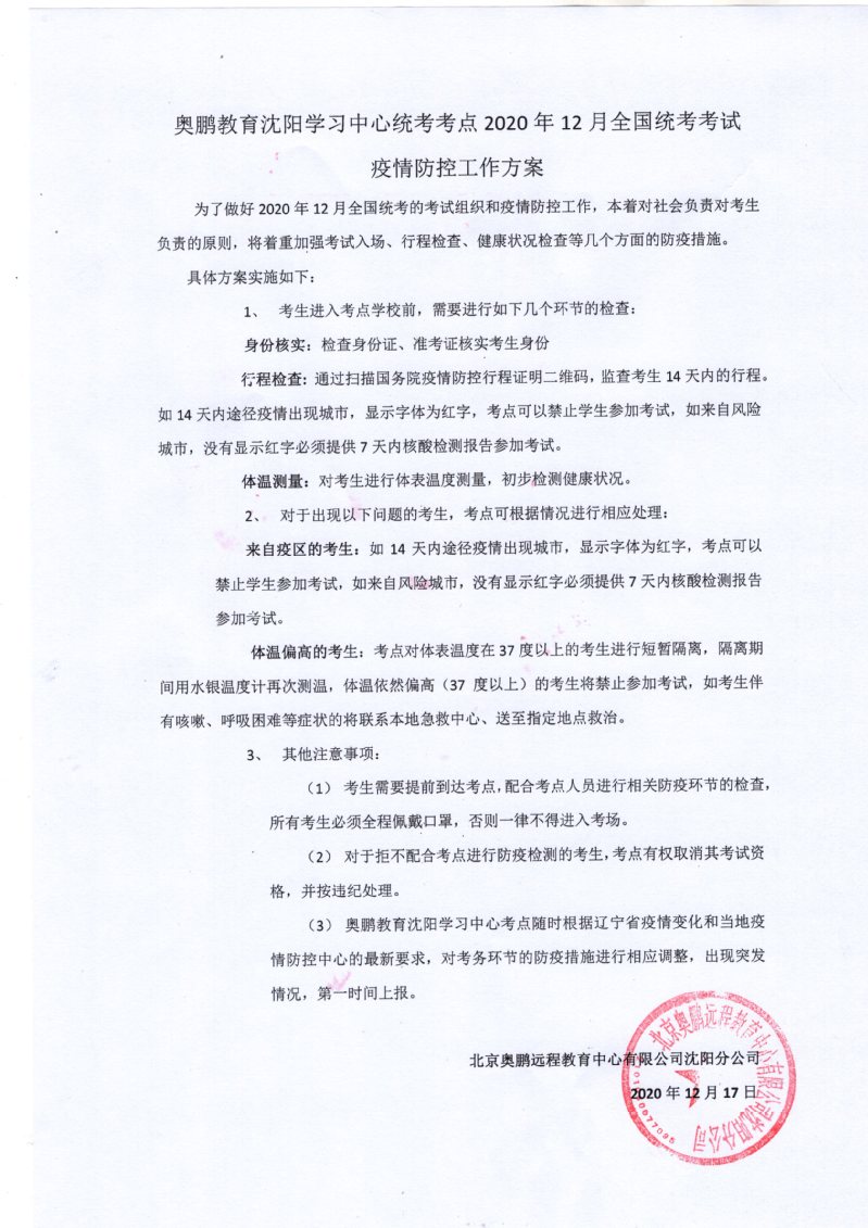 转发:奥鹏教育沈阳学习中心统考考点2020年12月全国统考考试疫情防控工作方案