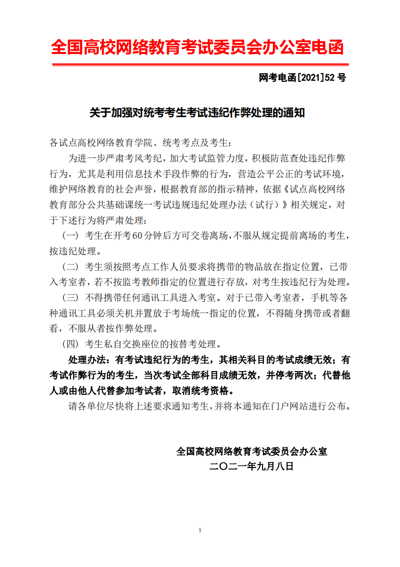 关于加强对统考考生考试违纪作弊处理的通知(网考电函〔2021〕52号)