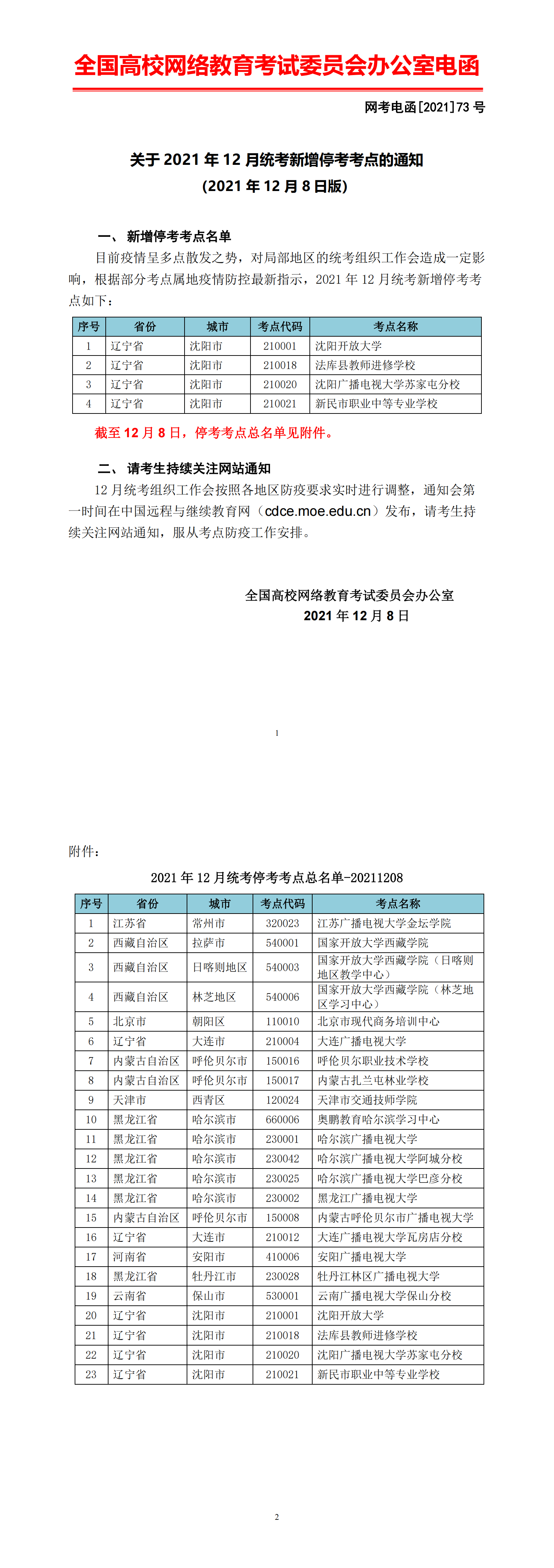 关于2021年12月统考新增停考考点的通知(2021年12月8日版)(网考电函〔2021〕73号)