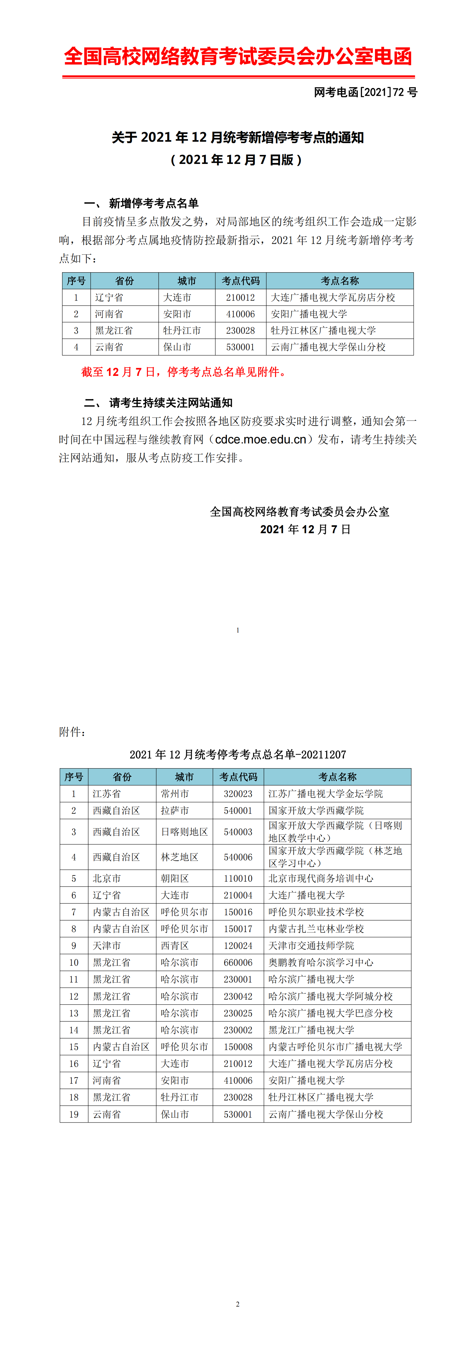 关于2021年12月统考新增停考考点的通知(2021年12月7日版)(网考电函〔2021〕72号)