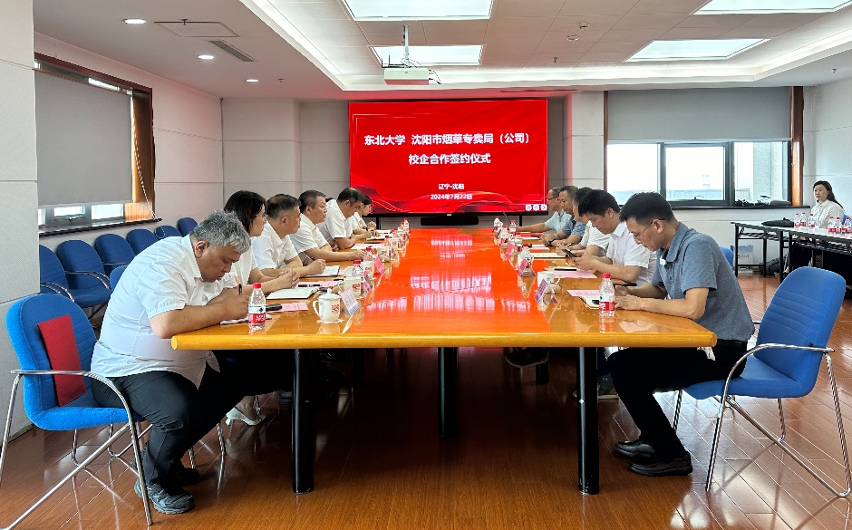 7月22日,东北大学与沈阳烟草专卖局(公司)校企合作签约仪式在主楼1401室举行。沈阳烟草专卖局(公司)党组书记、局长、经理王景波一行来访,东北大学党委常委、组织部部长张玉宝出席,合作发展委员会(服务东北全面振兴委员会)办公室、继续教育学院相关负责人以及软件学院教师代表参会。