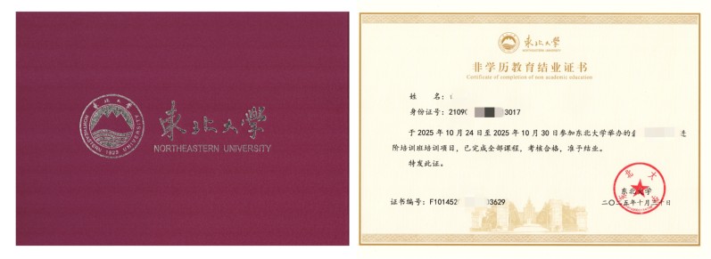 学员修完规定课程并经考核合格后,由东北大学颁发非学历培训合格证书,东北大学校园毕业合影。