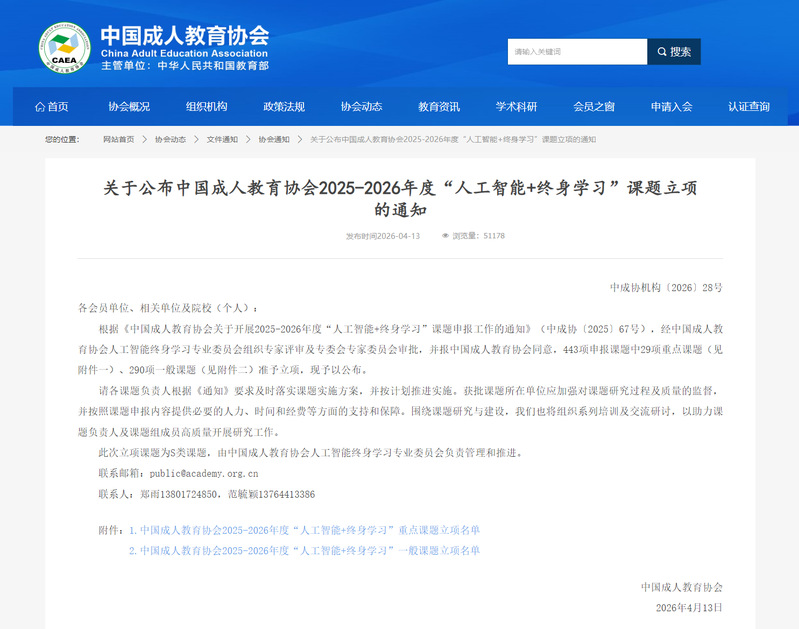 根据《关于公布中国成人教育协会2025-2026年度“人工智能+终身学习”课题立项的通知》(中成协机构〔2026〕28号),由继续教育学院初青松院长主持的《人工智能驱动产教融合机制与终身学习生态培育研究》课题成功获批中国成人教育协会2025-2026年度“人工智能+终身学习”重点课题项目。